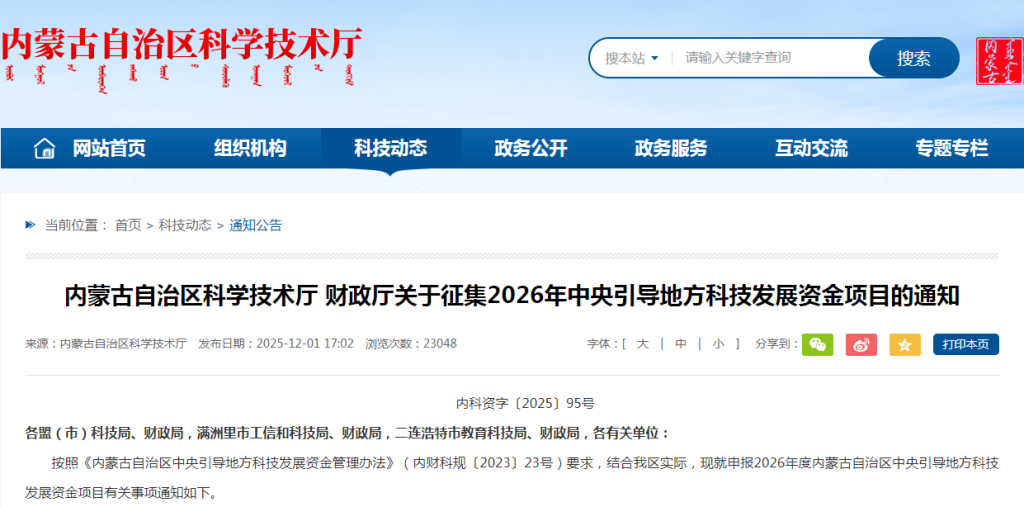 内蒙古自治区科学技术厅 财政厅关于征集2026年中央引导地方科技发展资金项目的通知