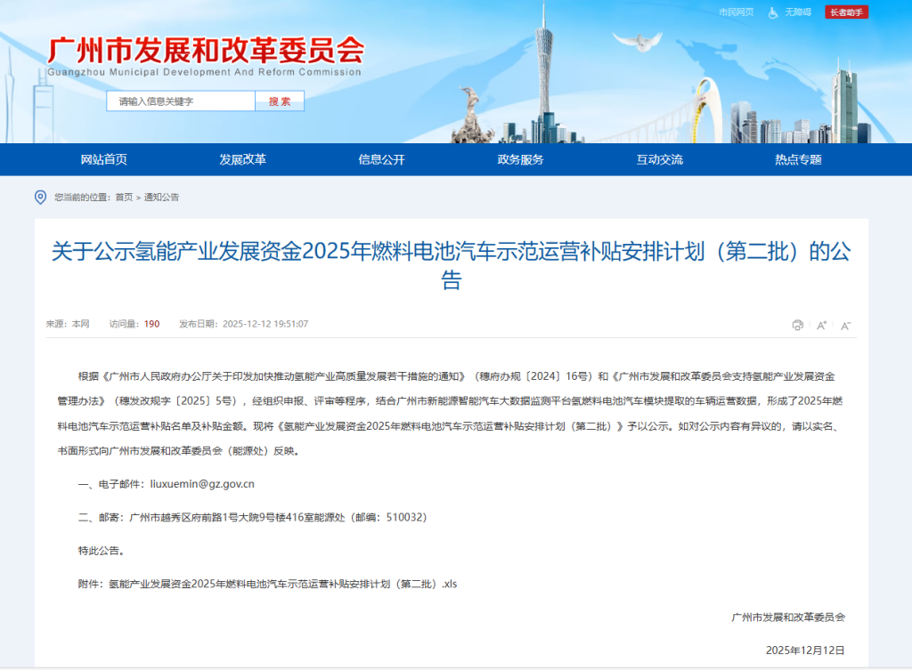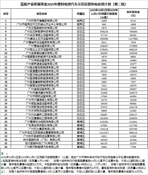 12月12日,广州发改委发布《关于公示氢能产业发展资金2025年燃料电池汽车示范运营补贴安排计划(第二批)的公告》。
